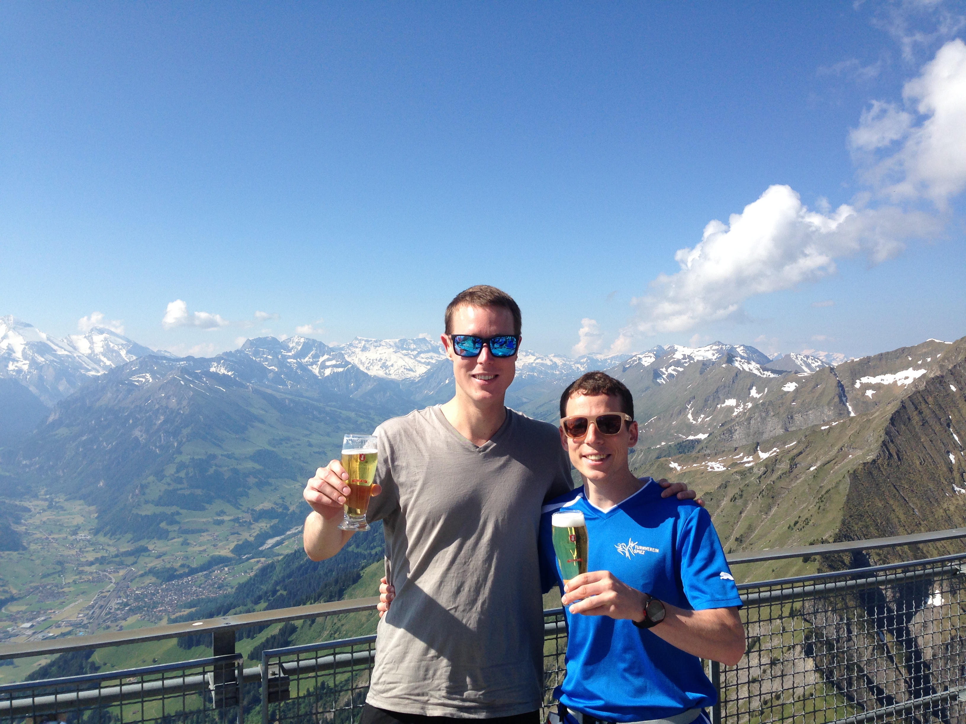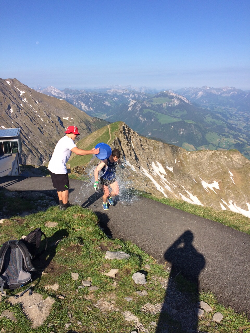 Am Samstag war es wieder soweit. Um Punkt 07:34:00 Uhr wurde mit Marco der erste Bergsteiger aus den Reihen des TV Spiez auf die Strecke bzw. Treppe geschickt. Jürg seinerseits durfte um 07:45:20 Uhr endlich loslegen. Vom Ende der Treppe bei der Bergstation der Niesenbahn führten die letzten Höhenmeter noch bis hinauf zur Gipfelplattform. Auf diesem letzten Abschnitt, rund 50 Meter vor dem Ziel, wurden Marco und Jürg von ihren Turnerkollegen, welche den Niesen von Wimmis her auf dem Wanderweg erklommen hatten, mit einer Dusche der besonderen Art willkommen geheissen.