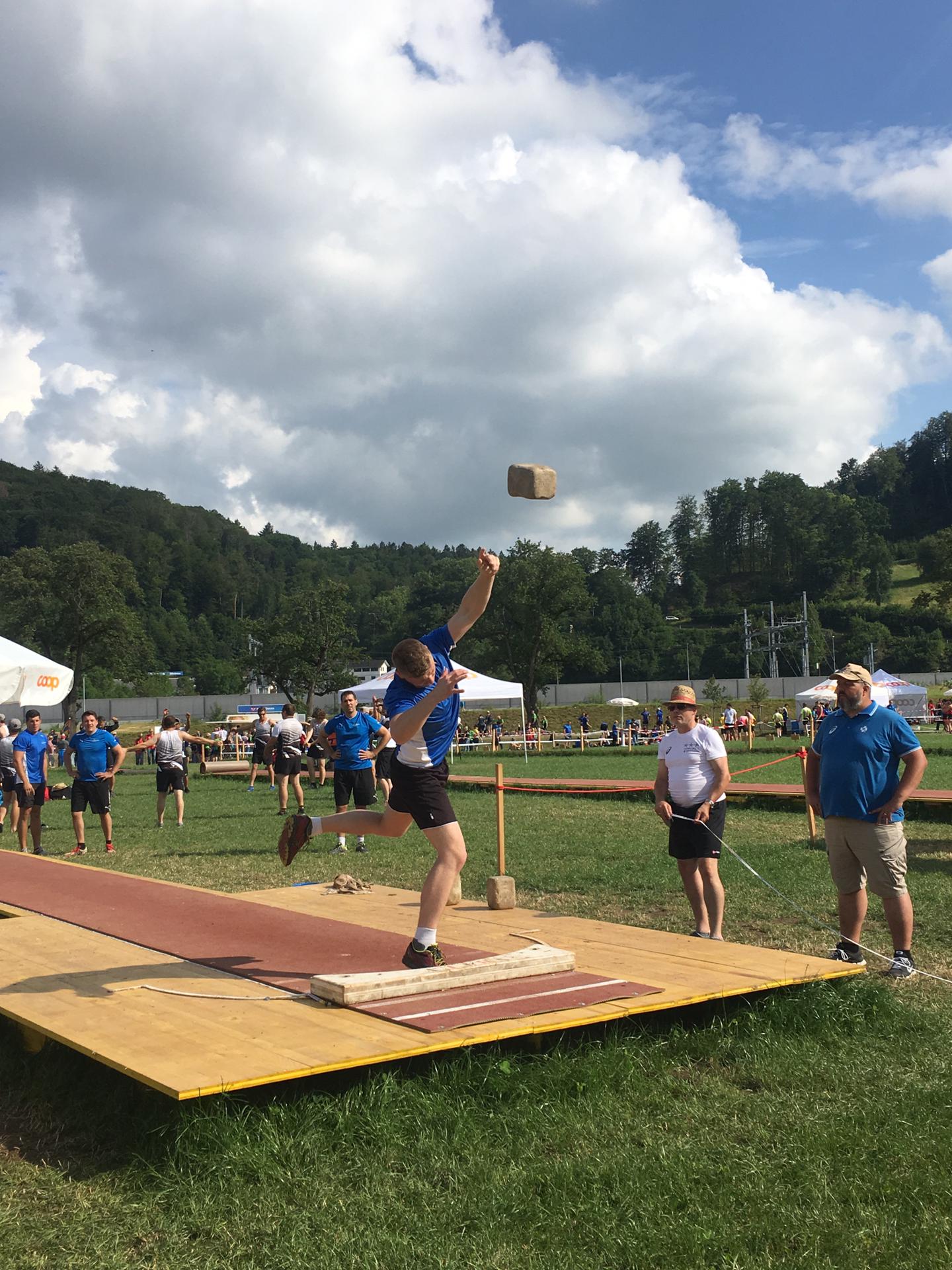 Am Samstag reisten die restlichen Spiezer Turnerinnen und Turner nach Aarau. Da es uns nun bereits zum dritten Mal in Folge so traf, dass unsere Einsatzzeiten auf den späten Abend festgesetzt waren, blieb immerhin mehr als genug Zeit für die Vorbereitung auf den Wettkampf. Begonnen wurde dieser mit der 80-Meter-Pendelstafette und dem Steinstossen im 1. Wettkampfteil. In der Pendelstafette starteten wir mit 20 Personen, welche auf zwei 10er Teams aufgeteilt wurde. Oberturner Sandro Schneider bewies Geschick, da die beiden Teams praktisch gleich schnell waren und sich so im Kopf-an-Kopf-Rennen gegenseitig pushen konnten. Die Note 8.85 war durchaus zufriedenstellend. Im Steinstossen, der schwächeren unserer beiden Disziplinen des Nationalturnens, gelang mit der Note 8.27 ebenfalls ein gutes Resultat.