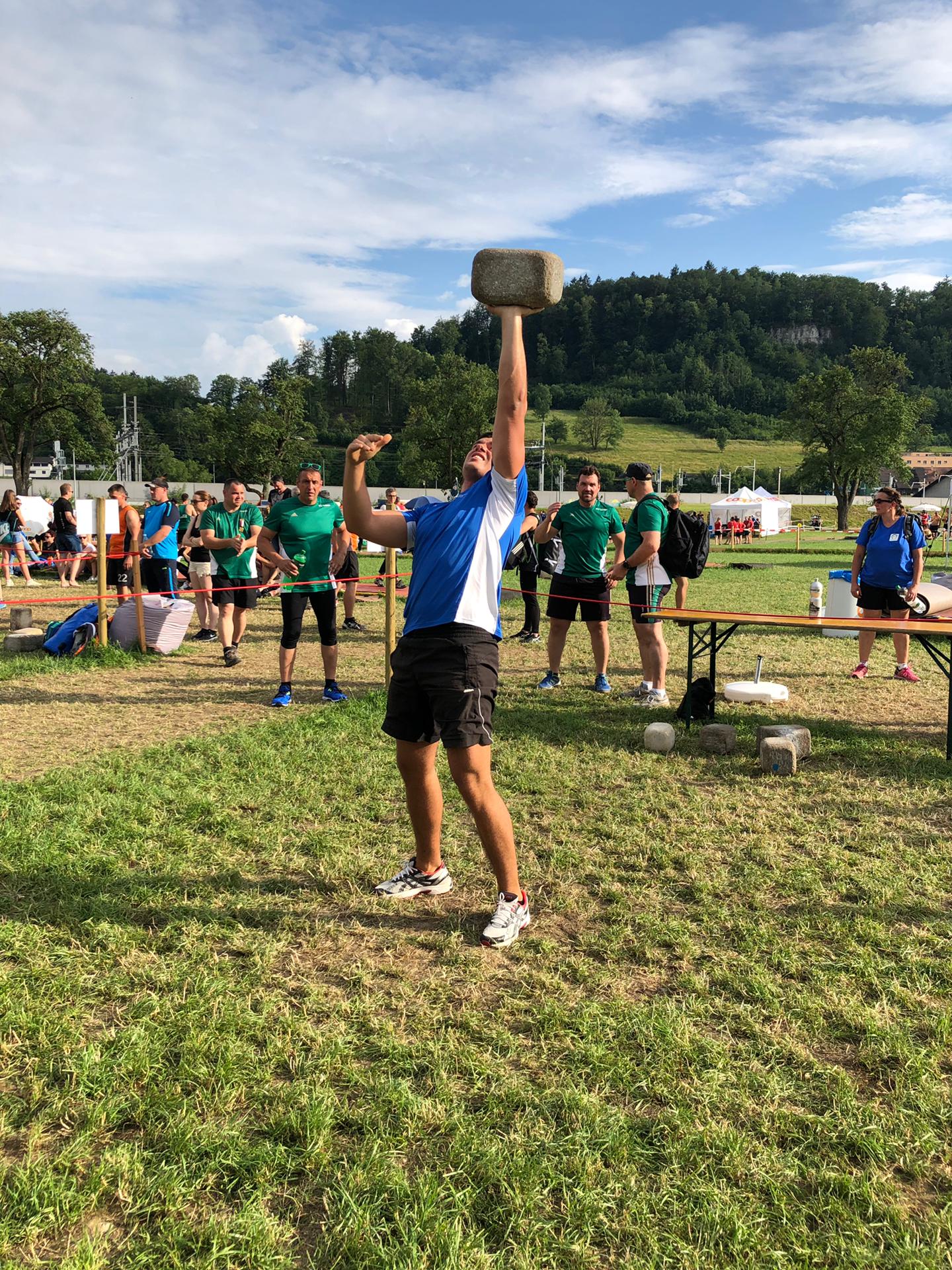 Im 2. Wettkampfteil stand der Fachtest Allround und das Steinheben auf dem Programm. In der erstgenannten Disziplin gelang es den Spiezern nicht, die gewünschte Leistung abzurufen. Die Note 8.70 stellt die schlechteste Fachtest-Leistung der vergangenen Jahre dar. Entsprechend gross war die Enttäuschung. Immerhin ist anzumerken, dass einige – meist sehr junge – Turner aus unseren Reihen zum ersten Mal in dieser Disziplin antraten und nach abgelegter Startnervosität zeigten, dass in Zukunft auf sie zu zählen sein wird. Im Steinheben traten unsere Nationalturner zum ersten Mal mit dem schwereren, 22,5-Kilogramm-Stein an. In den vergangenen Jahren hatten sie ihre Übung jeweils mit dem 18 kg schweren Stein absolviert, was eine Maximalnote von 9.00 ermöglicht hatte. Die auf dieses Jahr hin getroffene Entscheidung und das entsprechende Training zahlte sich aus: Die fünf Steinheber erzielten die Note 9.04. Jetzt, da sie sich an den schwereren Stein gewöhnt haben, dürfen wir gespannt sein, wie sie im nächsten Jahr abschneiden werden.