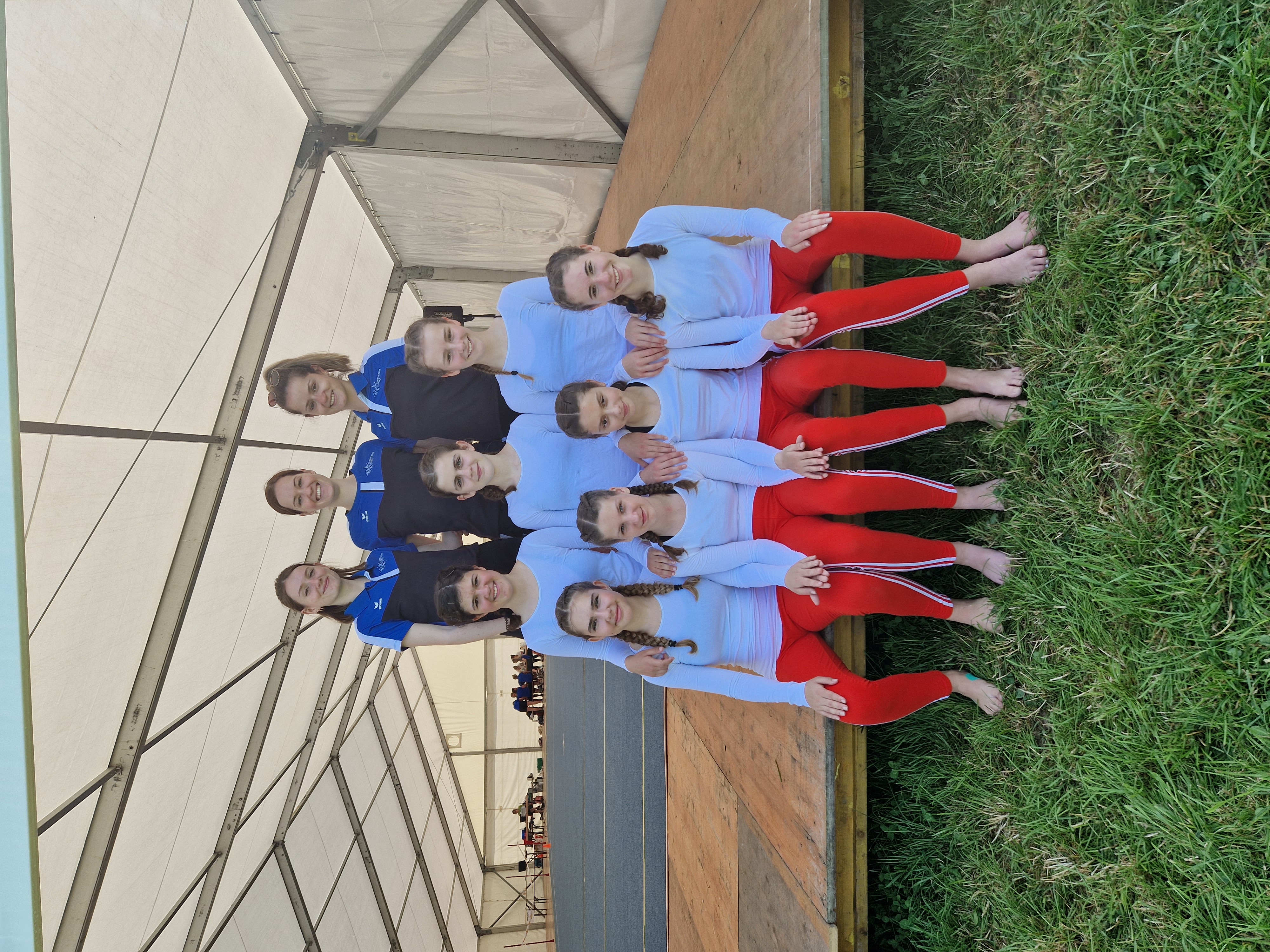 Als Erstes stand der Ballweitwurf auf dem Programm. Von der zeitlichen Verzögerung liessen sich unsere Kids nicht aus dem Konzept bringen. Es konnten alle ihre Leistungen abrufen, was mit der Note 8,38 belohnt wurde. Auch zum 1. Wettkampfteil gehörte der Gymnastik-Auftritt des JuGym. Sie konnten ihre Choreographie nach vier Jahren endlich wieder an einem Wettkampf zeigen. Die sieben Tänzerinnen turnten das abwechslungsreiche Programm auf der Gymnastik Bühne auf einem Feld mit der Grösse 12m x 18m, dies ebenfalls als Premiere (bisher auf Gymnastik Kleinfeld auf Rasen). Trotz der relativ kurzen Vorbereitungszeit schaute ein super Ergebnis mit der guten Note 8,71 heraus – herzliche Gratulation an alle Turnerinnen!