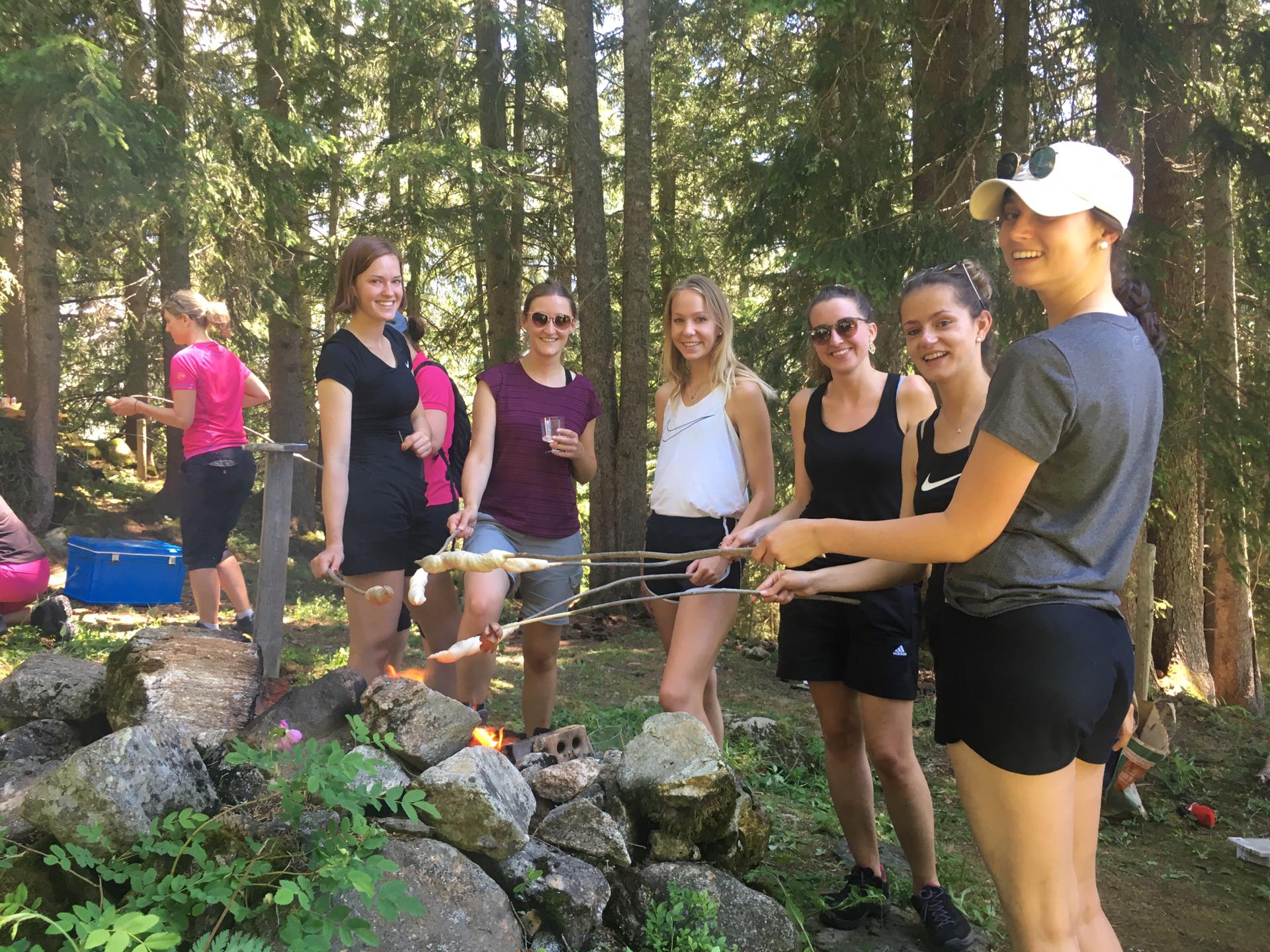 Nach den Aktivitäten stand der gemütliche Teil (Neudeutsch: Entschleunigen) auf dem Programm. Von Bort führte zunächst ein kurzer Spaziergang bergab zur Chrisegg, wo Tanjas Vater Roland im Schatten spendenden Wald bereits äusserst liebevoll eine gemütliche Pick-Nick-Umgebung eingerichtet, ein Apéro vorbereitet und fachmännisch ein Grillfeuer entfacht hatte. Tanjas Grosseltern, welche auf der Chrisegg fernab von jeder Hektik sesshaft geworden sind, zeigten sich ebenfalls sehr gastfreundlich und stellten uns insbesondere ihren Brunnen zur Kühlung der Getränke zur Verfügung, was bei diesem Wetter natürlich sehr willkommen war. Bei Cervelat und Schlangenbrot – dies stand vor Ort bereit – und allerlei selbst mitgebrachter Verpflegung (verhungern musste niemand, verdursten noch weniger) verbrachte die Spiezer Truppe so einen sehr gemütlichen und geselligen Nachmittag, welcher nüchtern betrachtet leider viel zu schnell zu Ende ging.