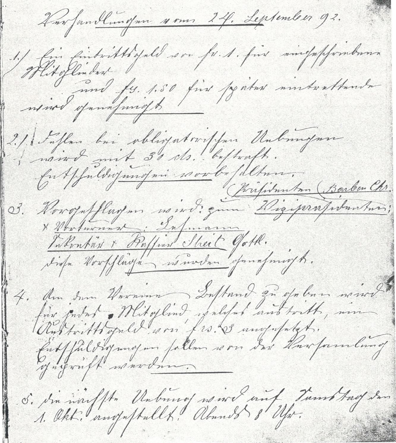4. Um dem Verein Beistand zu geben, wird für jedes Mitglied, welches austritt, ein Austrittsgeld von Fr. 3.– angesetzt. Entschuldigungen sollen von der Versammlung geprüft werden.