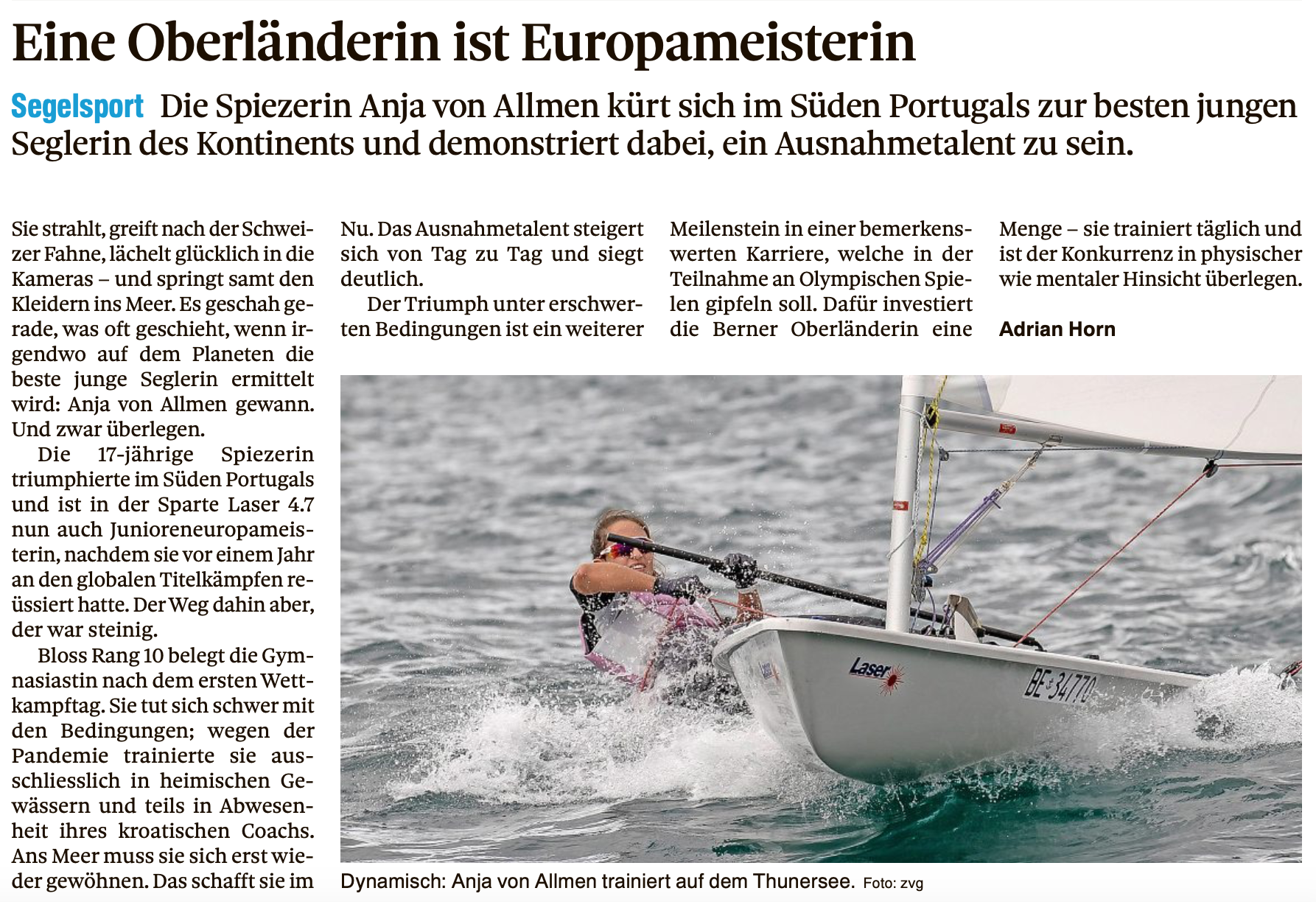 Die Seglerin Anja von Allmen hat sich in Portugal zur Junioreneuropameisterin im Segeln gekürt. Die Spiezerin war in der Vergangenheit oft am Donnerstagabend im Kraftraumtraining des TV Spiez anzutreffen, wo sie sich unter der Leitung von Heinz Maibach in Form gebracht hat. Der TV Spiez gratuliert Anja herzlich zu ihrem tollen Erfolg!